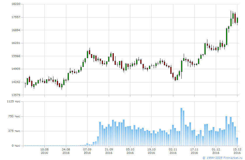 Биржевые котировки инструмента Сбербанк-ао_РТС-ф_dec16 предоставлены Московской биржей. Перераспространение информации только с разрешения биржи.