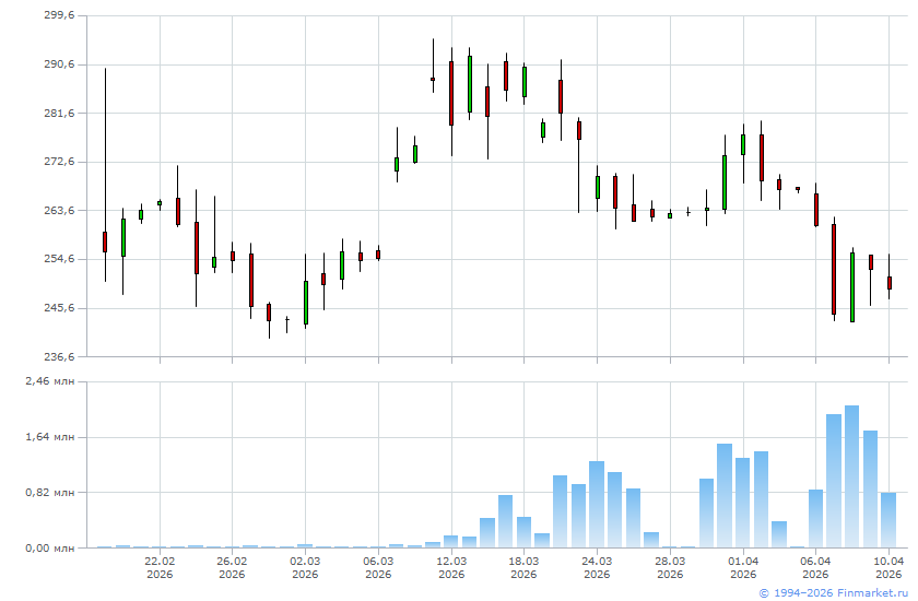 | МБ Срочный рынок Фьючерсы | RUB | 253 | 253,3 | 253 | -1,13 | - | 11 297 | 220 150 | 55 751 655,00 RUB | 10.04 14:40 | ||