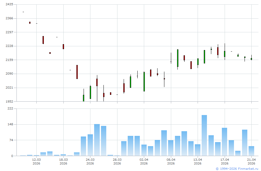 | Средневзвешенная цена дня: | 2 166,2000 |