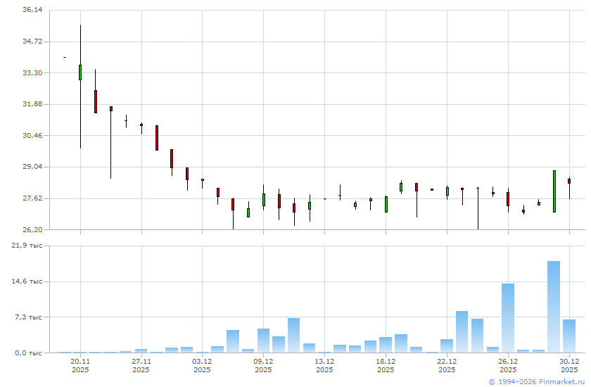 Главная / Аналитикам / Финансовые инструменты / Фьючерс ПРГАЗ ТТФ_МБ-Ф_JAN26 / Биржевые торги online