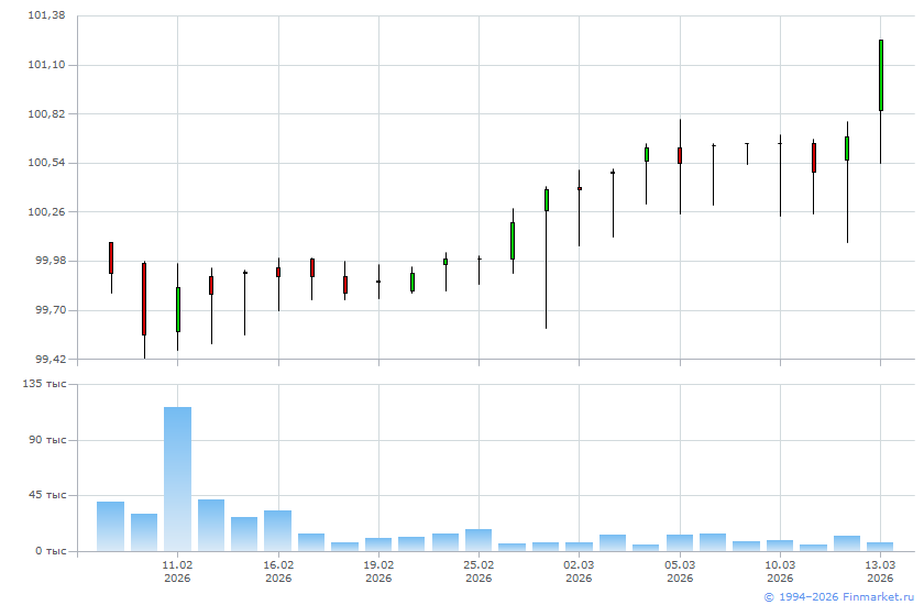 | Цена последней сделки: | 101,24 (+0,5500 / +0,55%) |
